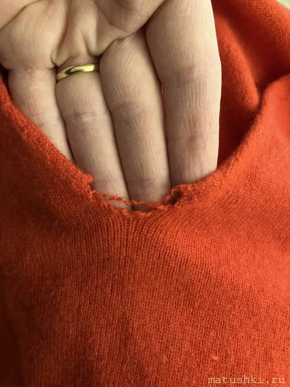 Хотела посоветоваться: у меня вот так разошелся стык на вырезе, выбросить жалко, это кашемировый свитер. Но боюсь, что не смогу его так сделать, чтобы был приличный вид. Как его отремонтировать? Ниток таких (вязальных) нет