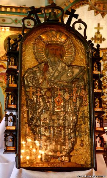 а во втором храме нашем сейчас стоит большая икона свт Николая Чернобыльская. в окладе с маленькими колокольчиками. и она тоже чудотворная и вся завешена дарами, даже видела там орден свой ктото подарил (видимо ктото из ликвидаторов последствий аварии на ЧАЭС).