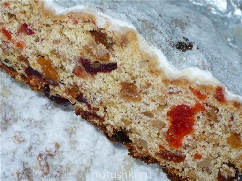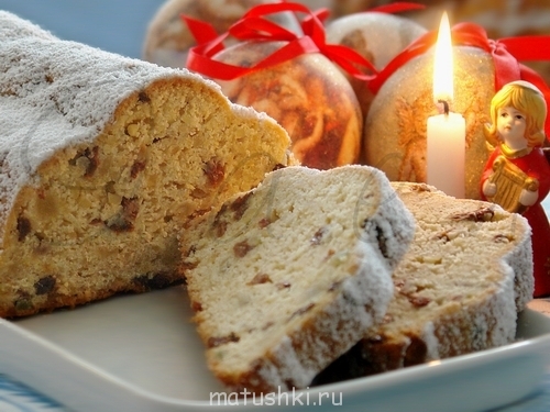 Ещё горячий штоллен освободить от формы, смазать растопленным сливочным маслом и обсыпать сахарной пудрой. Обмазку и обсыпку можно повторить для придания более пышной сахарной верхушки.