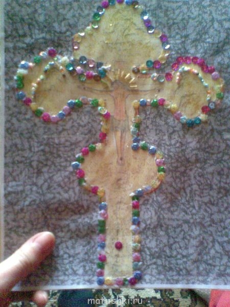 Аника, расскажите, пожалуйста, подробнее о вашем достижении! Рассматриваю- рассматриваю, но до конца не пойму... Это картон, пайетки, а крест наклеен? Большая работа, это все на одном занятии сделали? Красиво так и ровненько... молодчинка ваш сыночек!Аника:Наше первое "достижение" в ВШ.